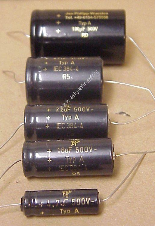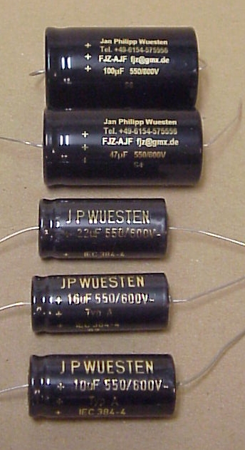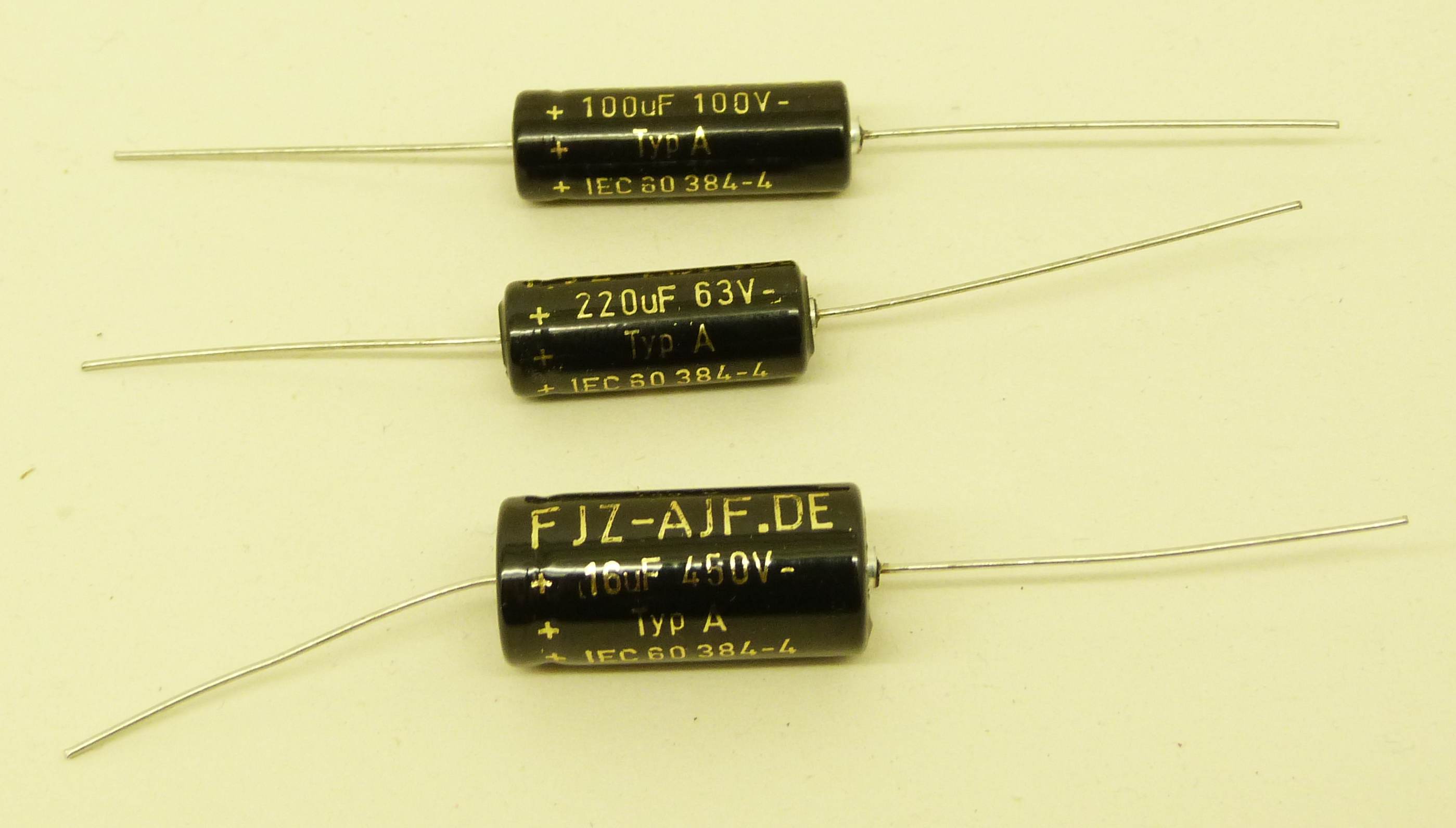 Axiale Gitarrenverstärker-Spezialtypen, eignen sich natürlich auch für andere Anwendungen. Radial kontaktierte Becherelkos finden Sie weiter unten in der Liste. | Axial leads Electrolytics for use in guitar amps. Those types have been specially designed to replace dead caps in tube guitar amps. | Condensateurs à vis axiaux constuit pour les amplis de la guitare | |||||