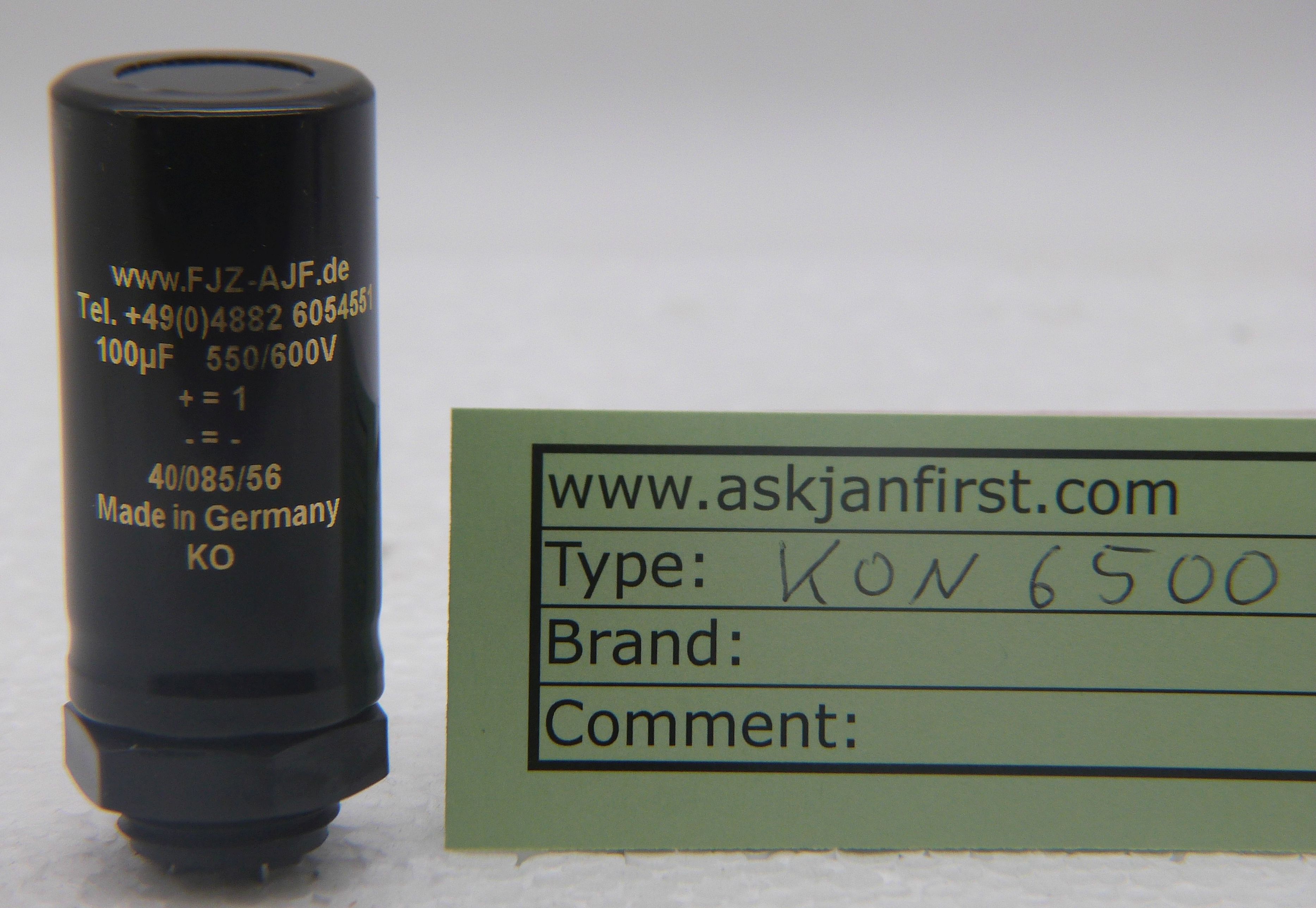 KON6500 | Einzelelko 100uF 550V, schlanker 25mm-Becher, Minus an eigener Lötfahne. Voll umschrumpft, zur sicheren Isolierung vom Chassis empfehlen wir trotzdem eine Scheibe. Problemlöser in Verstärkern, z.B. zum Ersatz von Einfach-US-Elkos | Single section 100uF 550V in slim 25mm (1") can, minus on separate solder lug, fully shrink sleeved. For isolated mounting we recommend use of a washer. Trouble solver in US amps replacing single section three prong twist mount caps | 100uF 550V dans un boite élégante de 25mm de diam. Cela a une broche minus au dessous et vous aide avec la restauration des amplis américaines. Pour l´isolation profonde contre le chassis installez avec rondelle bakélite SVP. | 18,39 | 21,88 | FTCap