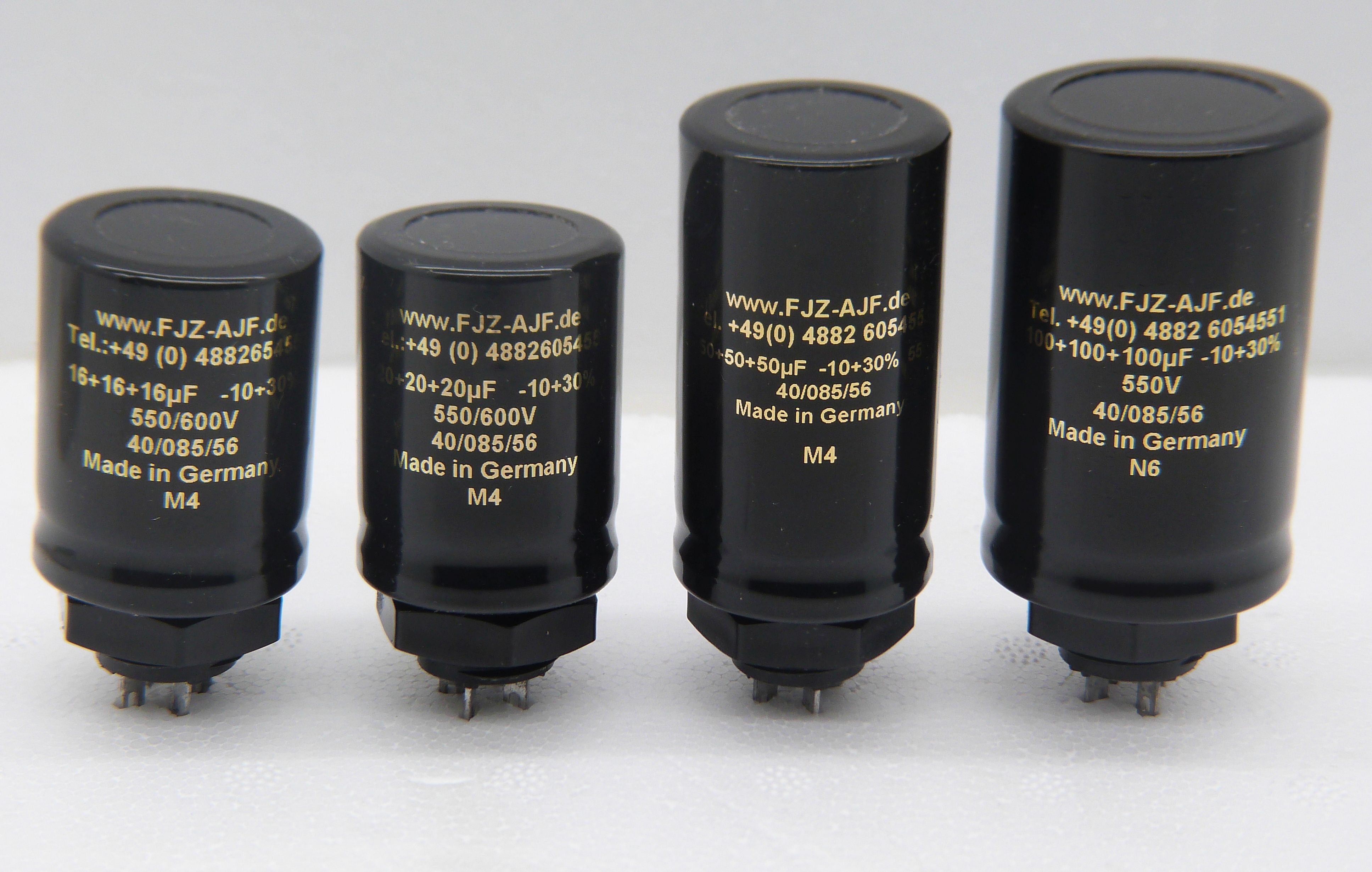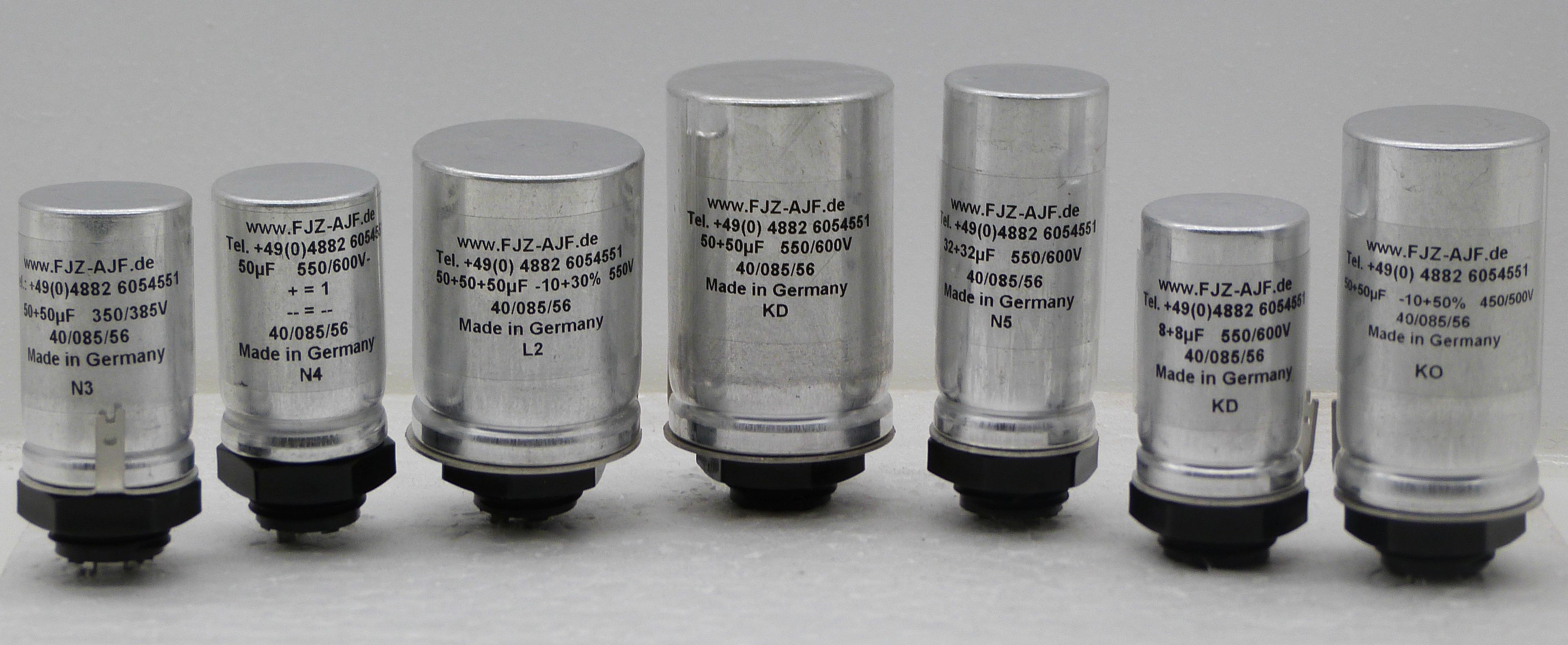 Voltage ratings: Most screw mount caps are designed with the maximum possible voltage rating of 550V working / 600V peak. This allows for maximum lifetime and reliability. Made with modern materials those mostly are even smaller than the original ones. Size-critical and special types are produced in the original voltage rating. You can always use a higher voltage rated cap to replace one with lower rating. Only limitation may be size, then see datasheet please or contact us. |