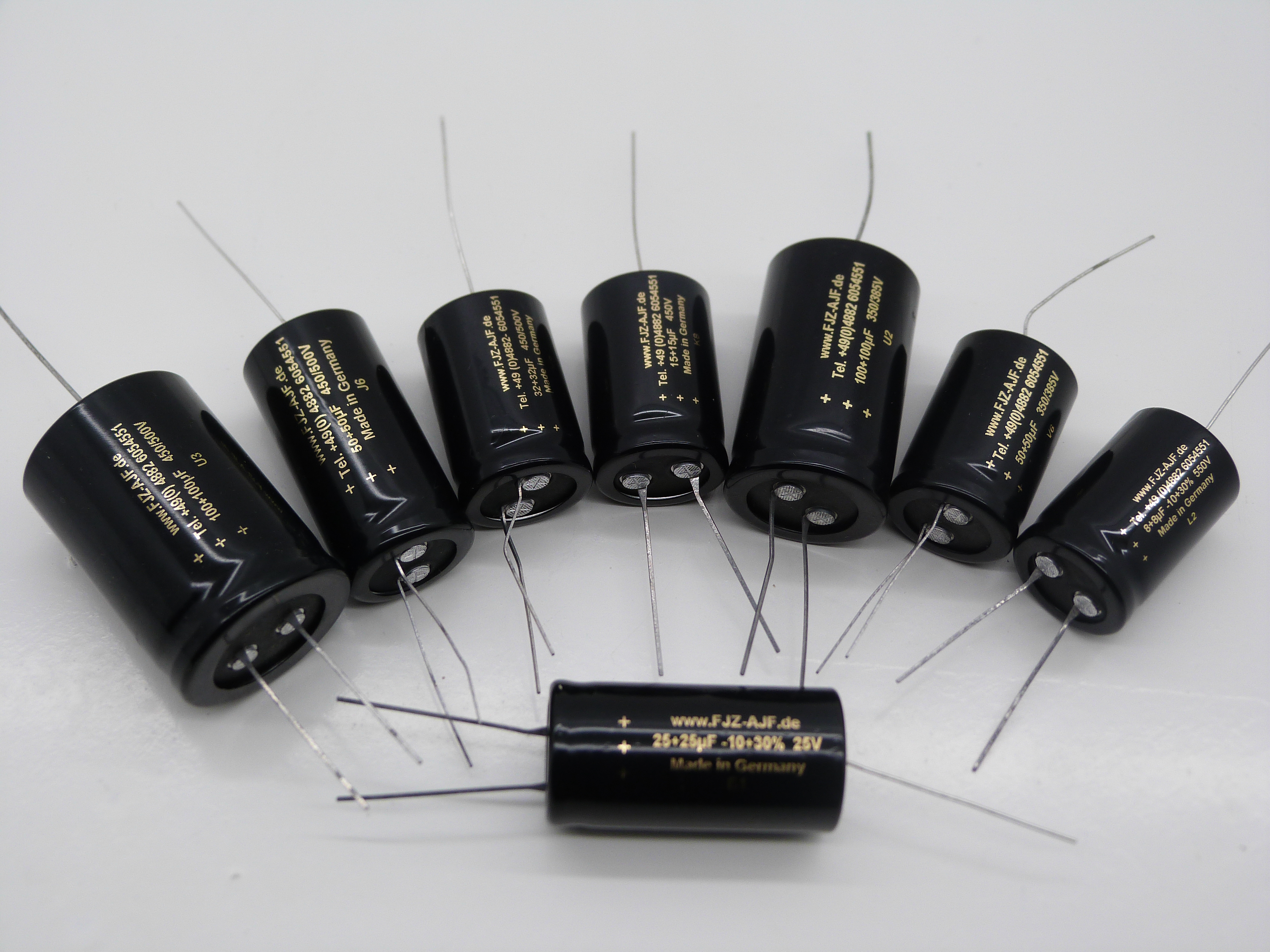 | Elkos mit Lötfahnen für die Reparatur von US-Verstärkern oder den Verstärkerselbstbau | Electrolytics with solder lugs for amps repair and new construction, to be mounted with bracket | Condensateurs avec contacts radials pour construire ou reparer les amplificateurs BF etc. Montage méchanique avec un collier. | ||||||