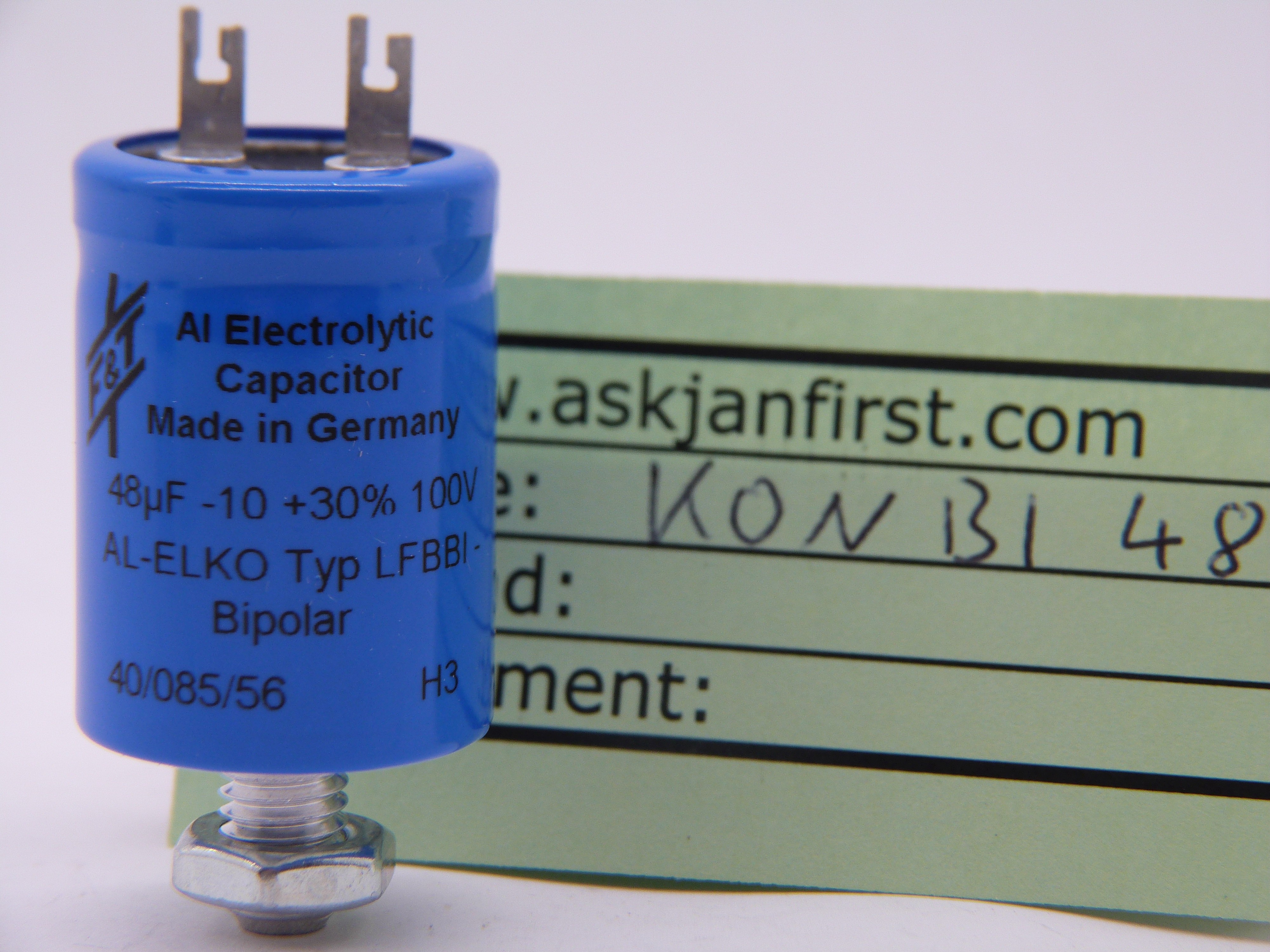KONBI48 | Bipolar-Motorelko für Echolette u.a., 48uF 100V, der hat echt noch gefehlt im Sortiment, nun ist er da. 25*45mm D*H | Bipolar motor run cap, 48uF 100V 25*45mm size can, used in Echolette, etc. This was long sought after, now we can supply it from the shelf. | Condensateur bipolair, 48uF 100V pour les moteurs dans les Echolettes, etc. Boite 25*45 | 14,75 | 17,55 | FTCap
