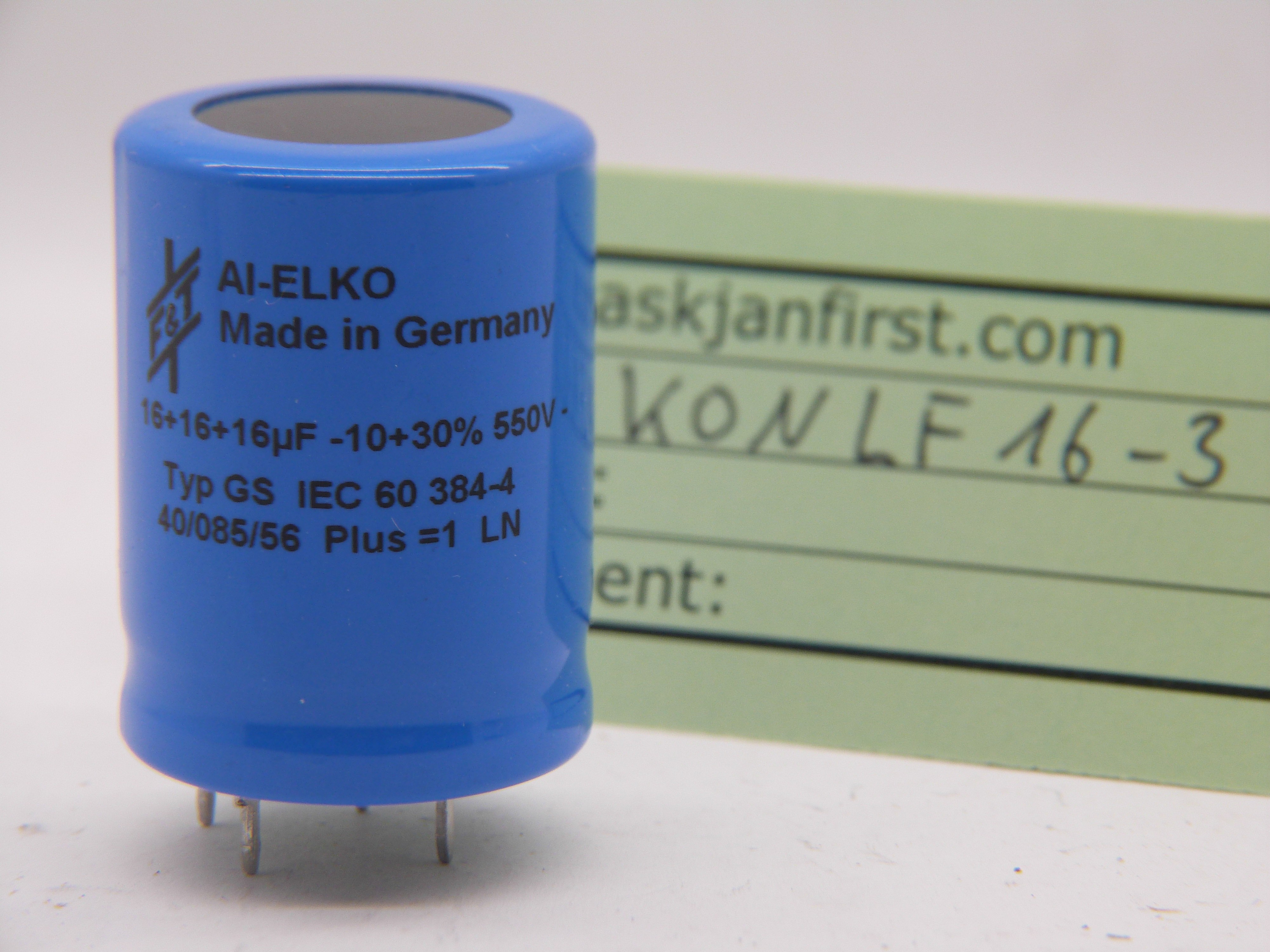 Radial electrolytic, current manufacture Triple-16 µF ( 16+16+16 uF), 550V (!) very very compact design, 30mm diameter, use in TVsets, as retrofit to fill cans, on PCBs and also for free wiring, pins allow both options. Use where space is REALLY CONFINED | Triple chimique, 3 * 16 µF 550 V Fabriqué en Allemagne, 30 mm de diamètre, très très très compacte pour utilisation dans les TV, comme retrofit, dans les amplis compacts, tuners etc. Excellent ou l´espace est vraiment très limité. | 16,59 | 19,74 | FTCap