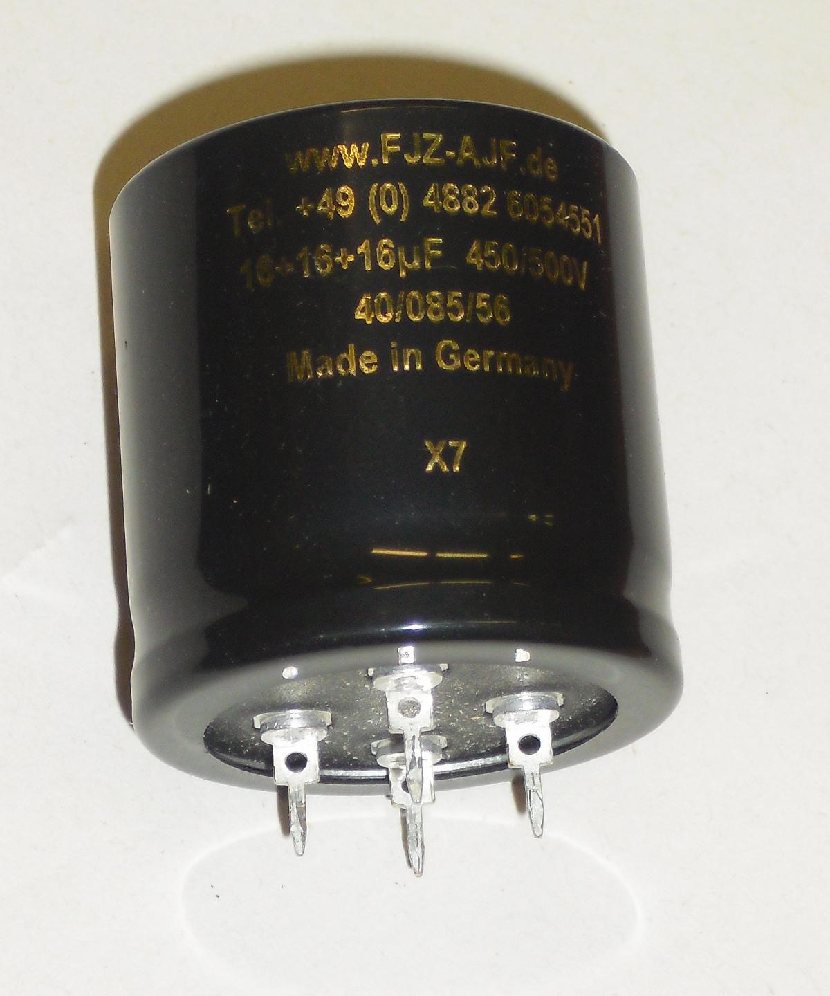 Radial electrolytic, current manufacture Triple-16 µF ( 16+16+16 uF), very compact design, 35mm diameter, use in PCBs and also for free wiring, pins allow both options. | Triple chimique, 3 * 16 µF 450 V Fabriqué en Allemagne, 35 mm de diamètre, très compacte pour utilisation das des amplis compacts, tuners etc. | 11,00 | 13,09 | FTCap