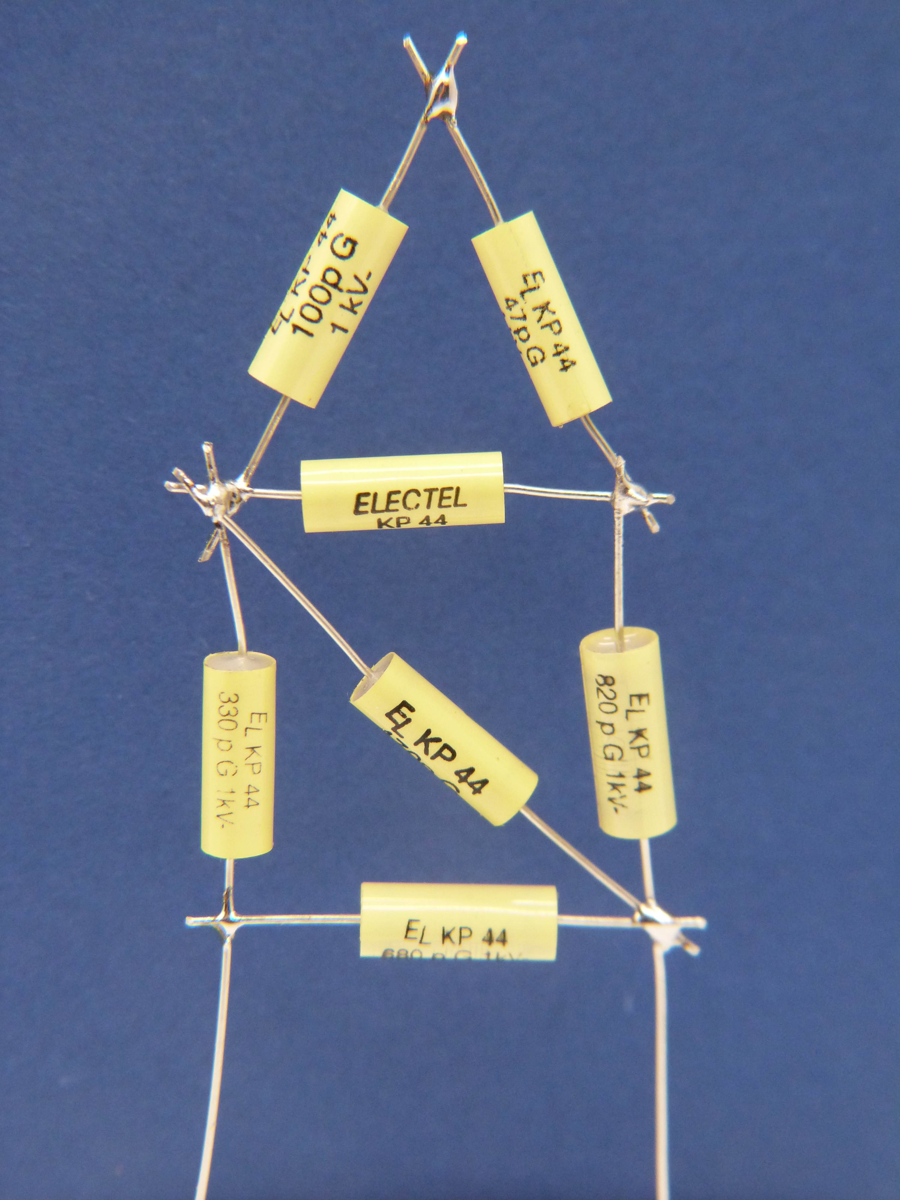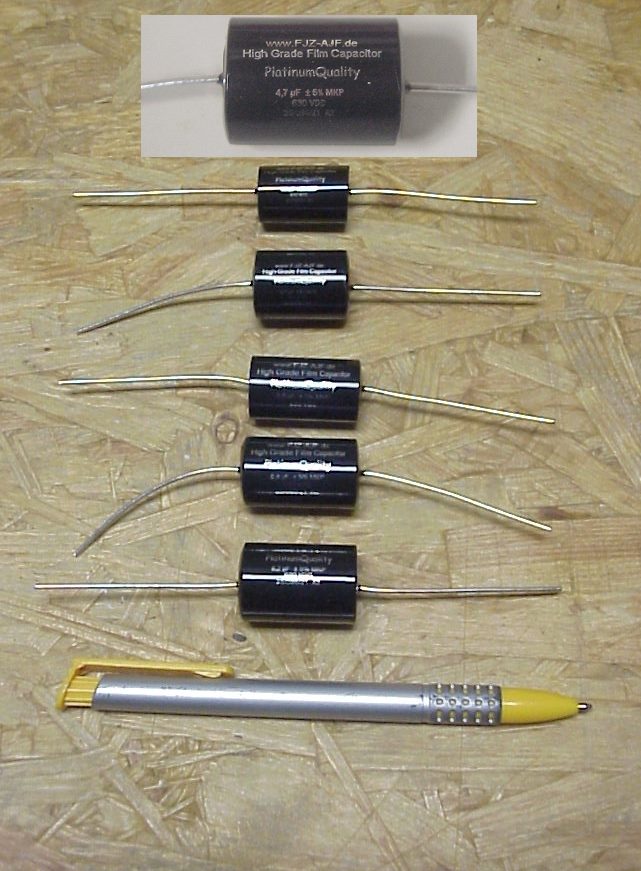 the best film availabe ( OK, Teflon is a little better but extremely difficult to use for capacitors). All those caps are built by the German Company Fischer&Tausche, FTCap which is also supplying our High volta ge electrolytics and Electel, Görlitz, Germany which is a company looking at a large history of capacitor development as well. Those axial leads caps are rated at 1500 VDC for 1nF up to 1 uF, 1000VDC for 10 uF and the small ones between 47pF and 820pF and 630VDC for all other types between 2,2uF and 100uF. The black color makes them suitable for visible mount in high quality gear and also suitable for replacement of vintage, tar-impregnated black caps in old radios of the 1940´s to 1960´s. Because these caps are wound as internally series connected sections, they provide low loss, low inductance and superb stability. The axial wires are made of extremely pure, soft copper with tinned surface for easy solder mount and corrosion protection. The caps are sealed with epoxy resin. We supply our range of High Grade Caps from 0,001 mFD up to 100 mFD (!!) Please take care of the international notation: 1000pF = 1nF = 0.001 µF All KHG... film caps are RoHS compliant |