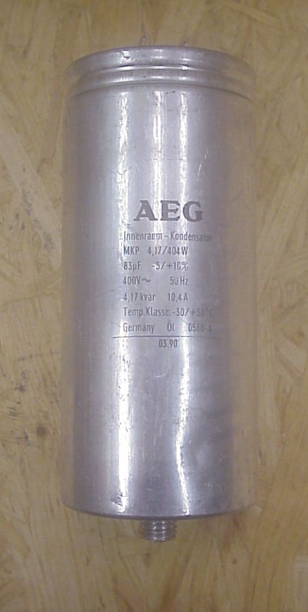 | Fabrikat AEG. Kompakte ölgefüllte MKP-Kondensatoren im Alugehäuse, für allg. Anwendungen etc. Ausbau, geprüft. | AEG brand compact oilfilled polypropylene power capacitors. Used, tested. | Condensateurs AEG, polypropylène huilé, haute qualité, occasion, testé | ||||||